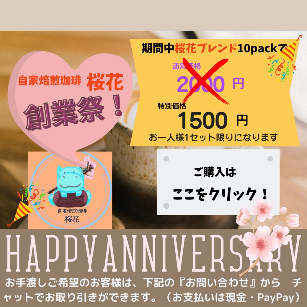 皆様の応援で「自家焙煎珈琲桜花」三年目に突入することができました